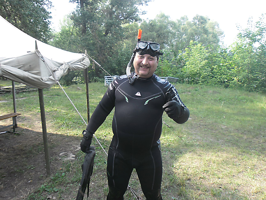 ...Течение в Десне очень сильное, глубина нарастает быстро, видимость в воде сантиметров 30-40, а дно в том месте , где мы были , завалено бетонными блоками и корягами ... В общем, нырнув разок, я понял , что надо быстрей выбираться, ибо когда течение несёт и долбит об камни, а ты не хрена не видишь, то это уже не удовольствие ... а самоубийство...